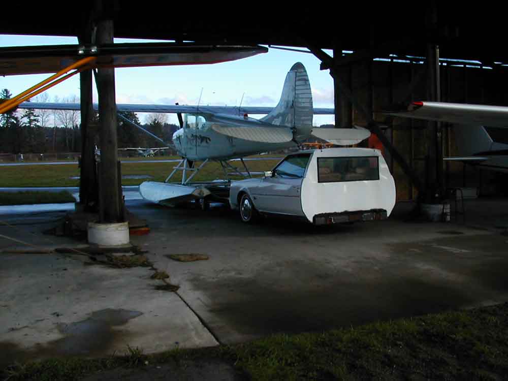 Monday December 30 - we tour the glacier Morning of Monday, our third day, comes. We head into town (Courtenay) to the local heliport. They have some ... novel vehicles here. That is just what it looks like - one half of a Buick Riviera. What you don't see is a steel-beam dolley and hydraulic lift, sticking out of the front grille, that the floatplane is resting on. |