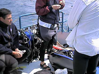 I was buddied up with a girl named Cam, (five foot tall Ellen Degeneres). We got suited up during the trip over to the first dive - The Caves. We moored off these cliffs that were 30 feet straight up, and dove into 20 feet of clear water. We tooled around in the rocks for a while, the bottom was very different than my other dives - the boulders were so big I could swim between them. Then Cam took me into the cliff face, through a tunnel maybe five feet high and ten feet wide. Just as the light behind us faded out, a deep blue glow appeared in front of us, and we popped up into a grotto inland, where hikers were walking by, and swimmers were swimming. Out again through another cave, and then I insisted my buddy take me as deeper. We followed the bottom away from the cliffs, and before I knew it I was at 50 feet. I would never have known it if I hadn't checked my gauge. All the changes take place in the first 20 feet, after that, not much different.