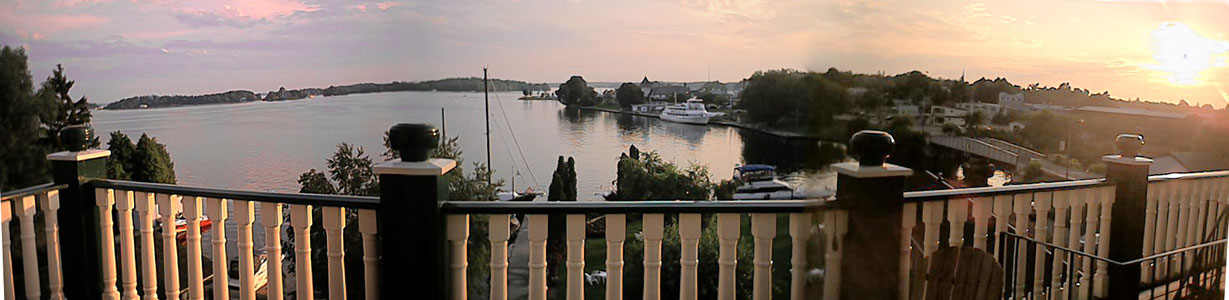 Our first stop: Gananoque. All they have left was a room with a private deck overlooking the grounds and waterfront. | |