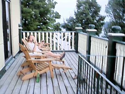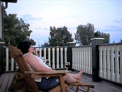Tuesday 3rd - Home The Executive Summary Head out from T.O. ~1PM, take a detour to High Perspective airfield. Don't find it, but this does put us on Hwy 7 heading east. We follow that all through Peterborough and eventually to Gananoque, where we pull in around 6. I want a place by the water, so we drive south until we hit water and then check in. The lady says "all we have left is a room with a King-size bed, a fireplace, a Jacuzzi, and a walkout to a private deck over looking the river." I say, "Sounds terrible." Liquor store is closed, but we are saved by room service, who have a wine, fruit and cheese plate all ready. Otherwise, that deck and its sunset would have been useless. The Picturebook How the vacation starts. Not to be discounted. This is not a mad dash to hit the road. We spend the first few days of our vacation in Puerto Backyarda. |