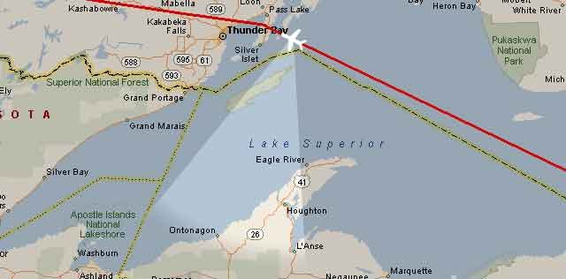Our departure went pretty much without a hitch. Very little to see but clouds until over Lake Superior. However, it cleared up long enough that I managed to locate us. That land mass there? That's the "eye" of Lake Superior.