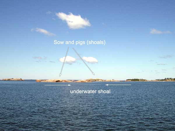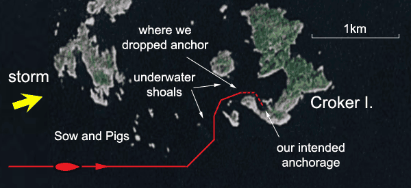 The shoals we were navigating when the storm hit. (This is the next morning on the way out.)