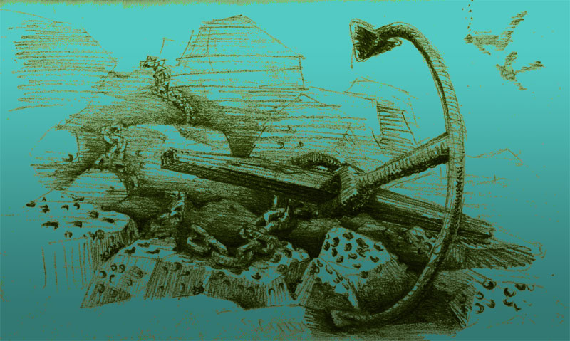 a piece of glass with printed pattern, a piece of mirrored glass silvered on one side, and what I'm pretty sure is a porcelain toilet bowl. This would have to be the lavatory. It gives you a creepy feeling when you encounter items that strongly remind you there were human beings on this ship before it became a wreck. Did they survive? If I dig far enough, will I encounter more personal items of humans? Rings? Fillings? Bones?