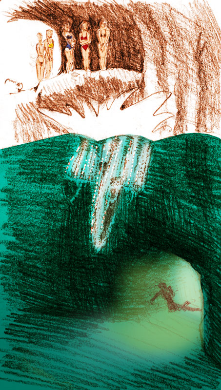 The CavesWe exit through a larger passage and come up next to a small, enclosed, stony beach, there are hundreds of beach-dwellers sdplashing about. Overhead, about four stories up, and in some case more than 6 stories up, adventurous teens are climibng the cliff face and performing death-defying 60 foot leaps into the water, being careful to dive between the giant underwater boulders.